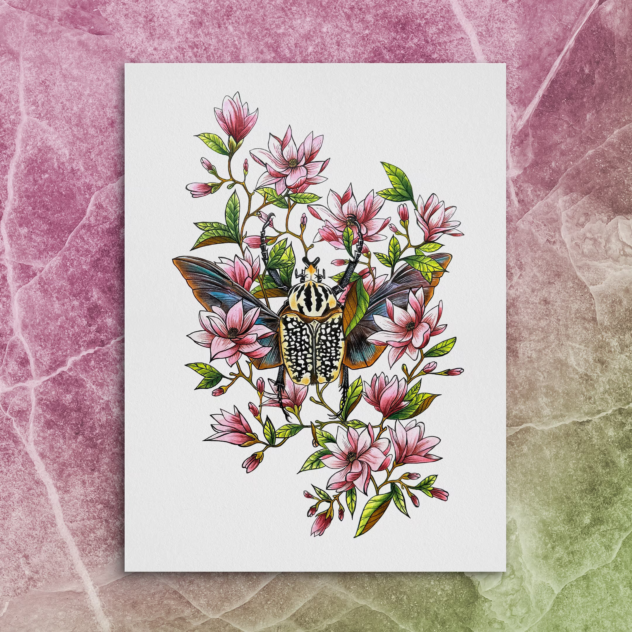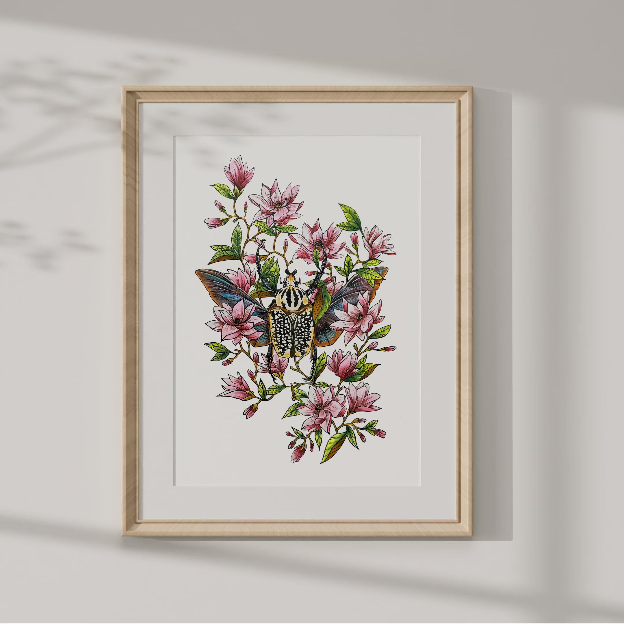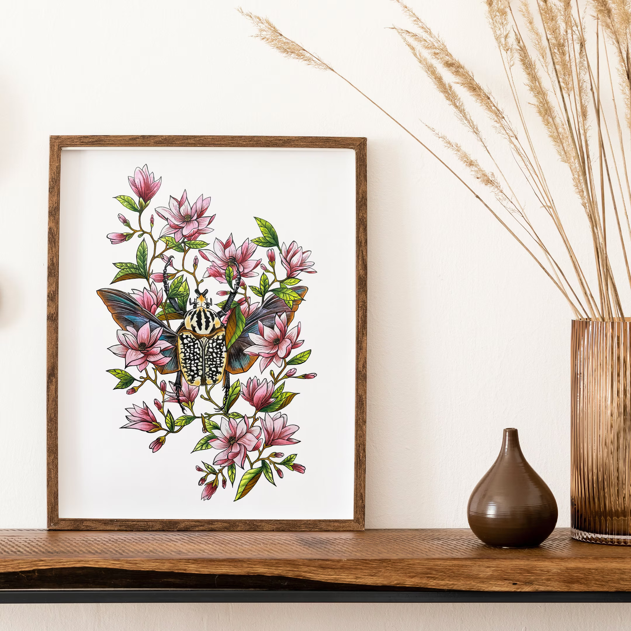 Bring a touch of captivating beauty to your space with this stunning Giclée print, featuring the majestic Goliath beetle resting amongst delicate magnolia flowers.