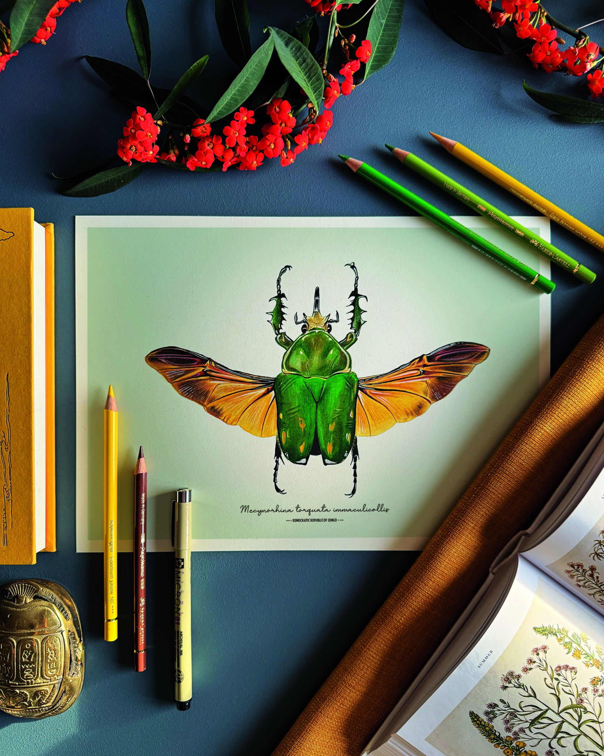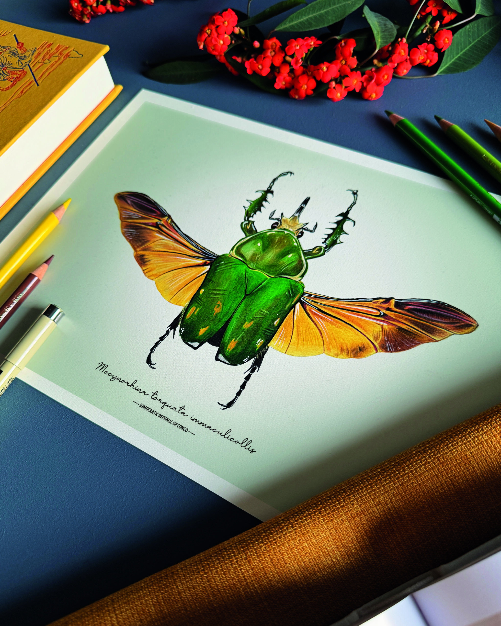 Hand-drawn in coloured pencil, this piece captures the beetle’s smooth armour, warm tones, and every subtle detail with precision. Perfect for collectors, nature lovers, and admirers of scientific illustration, it pairs beautifully with minimalist, botanical, and naturalist interiors.