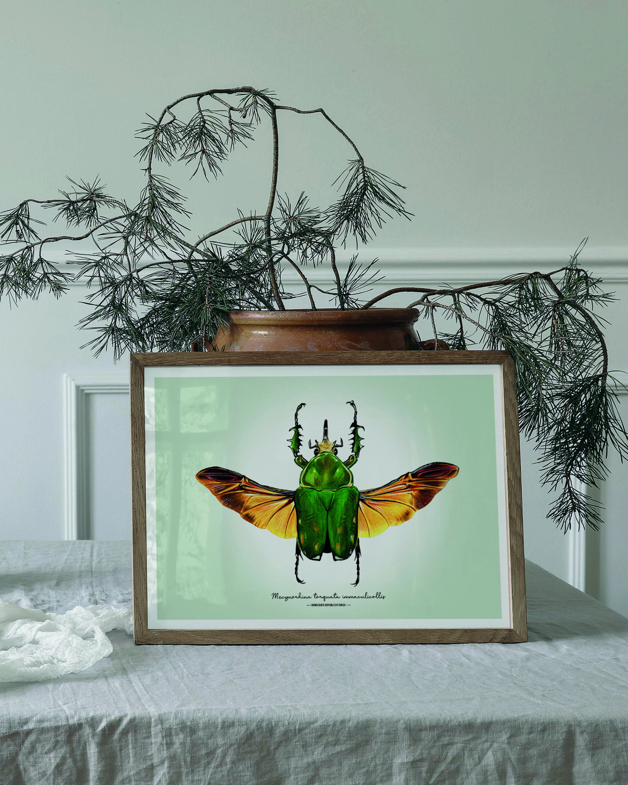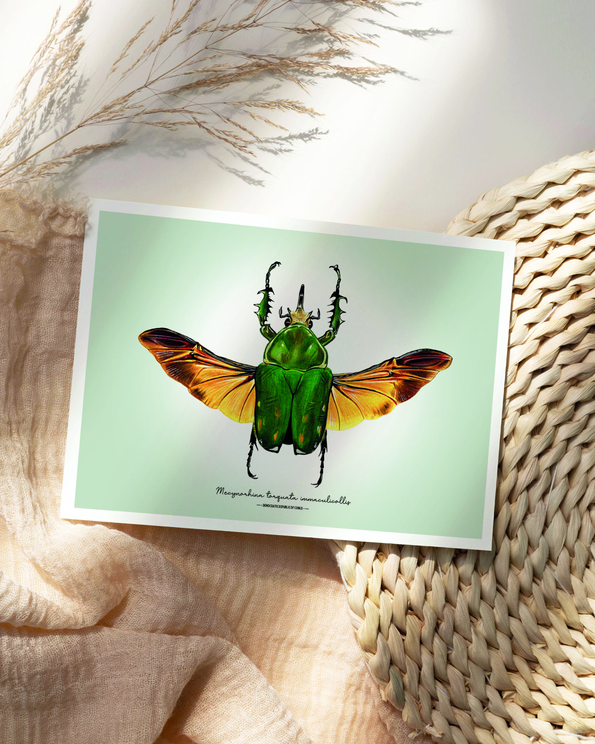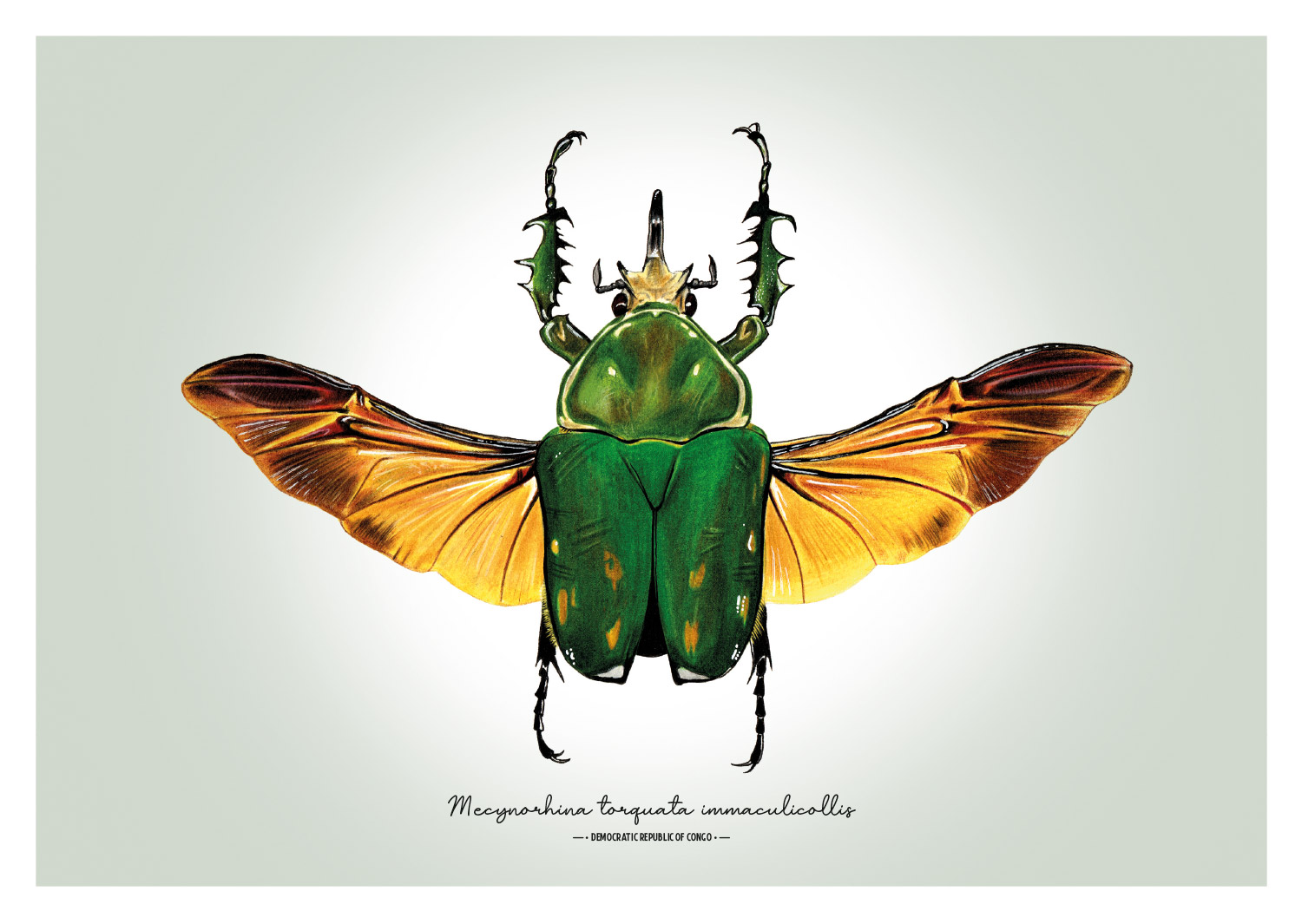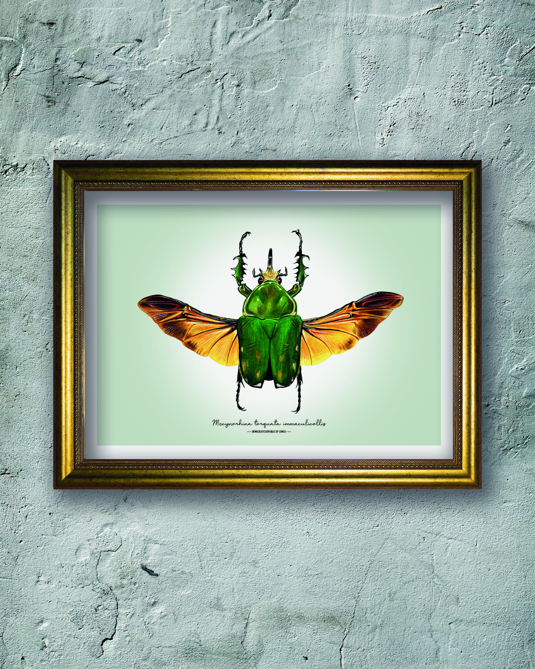 Bring a touch of natural elegance into your home with this detailed illustration of Mecynorhina torquata immaculicollis. Shown with its wings carefully spread, the artwork reveals the intricate structure normally hidden beneath the elytra — a striking, open-wing display that highlights both strength and delicacy.