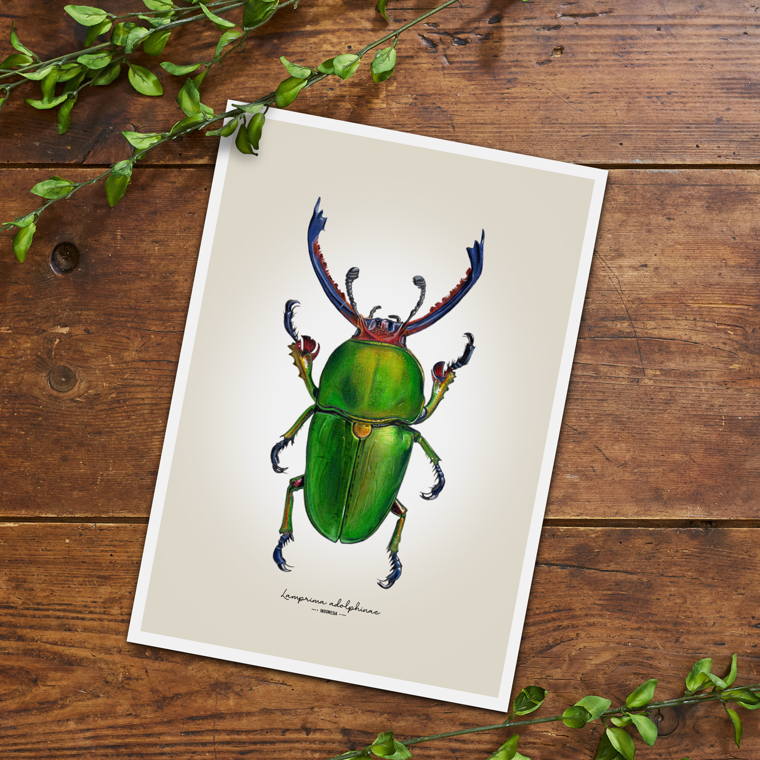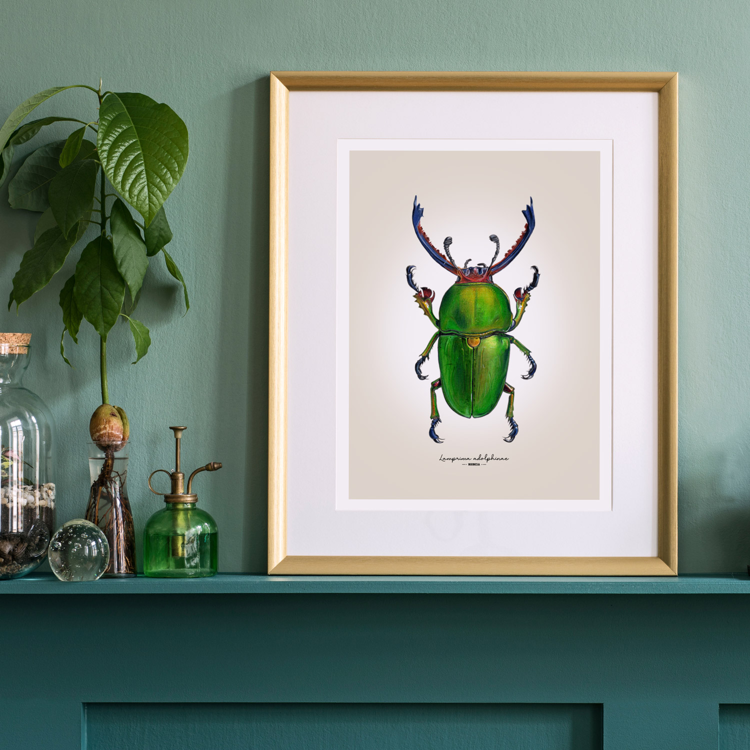 Adorn your walls with the captivating beauty of the Lamprima Adolphinae beetle – a majestic creature captured in a stunning Giclée print!