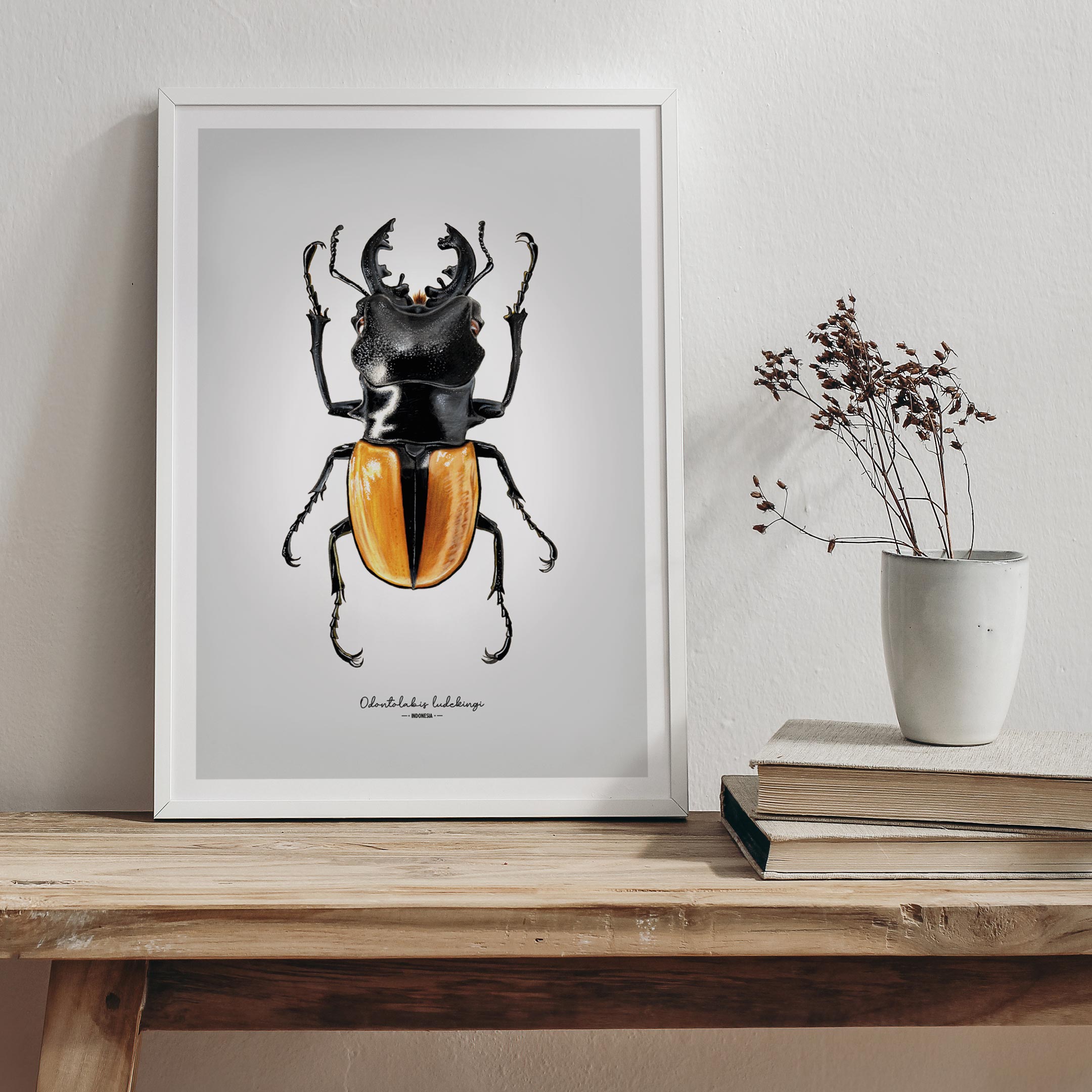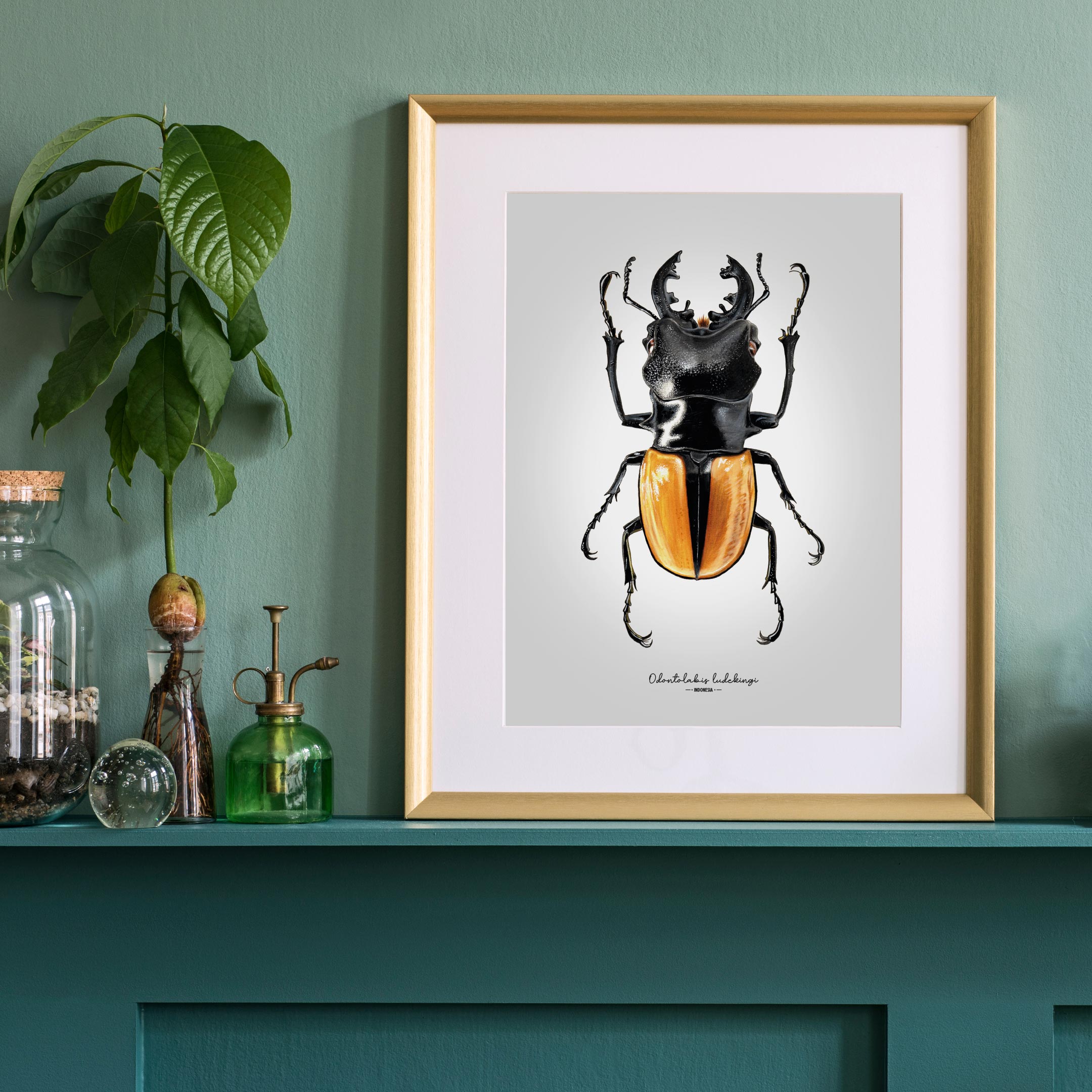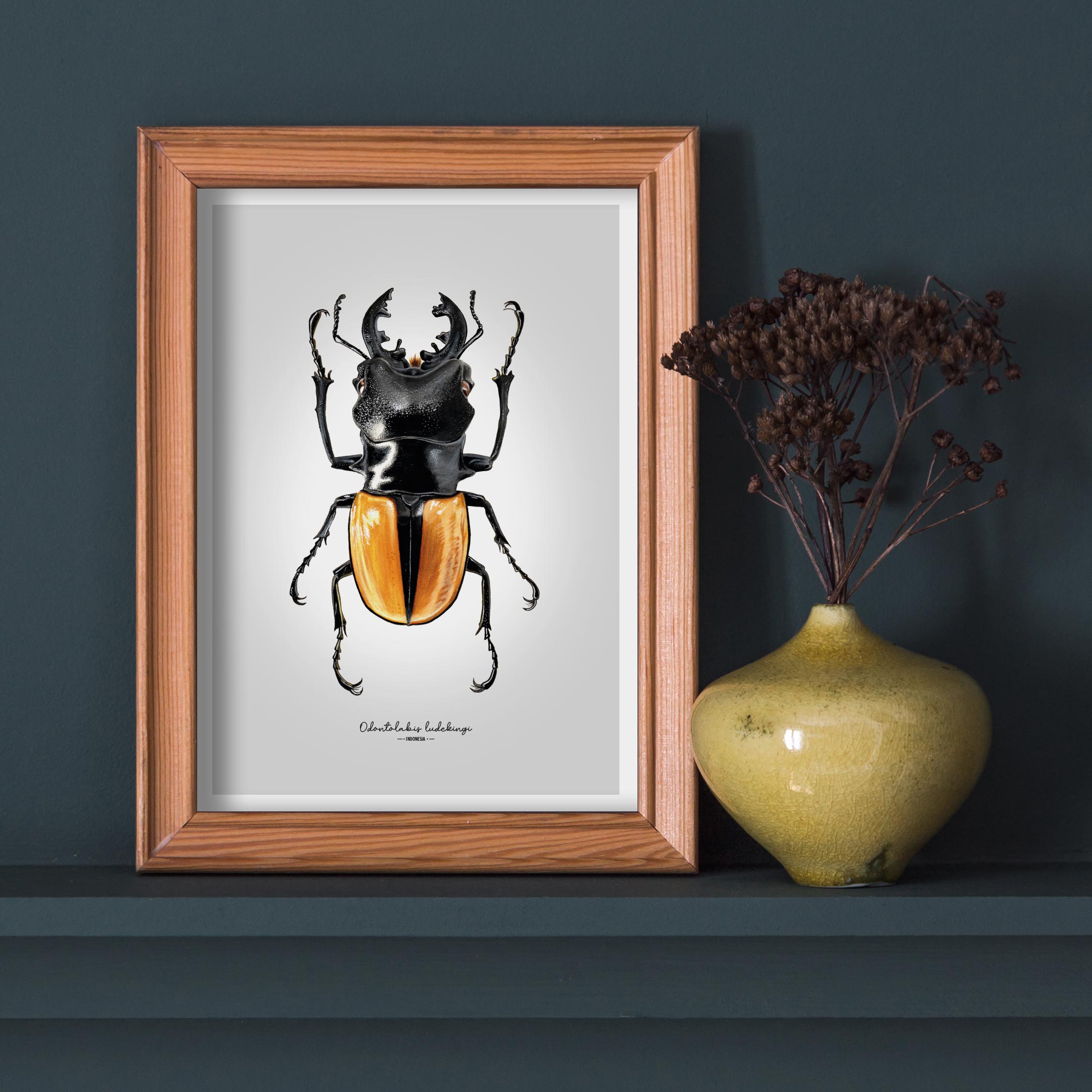 This stunning fine art print features the magnificent Stag Beetle Odontolabis ludekingi, a stag beetle known for its dramatic contrast. The deep black body is offset by rich yellow/brown elytra, creating a captivating display of nature’s artistry.
